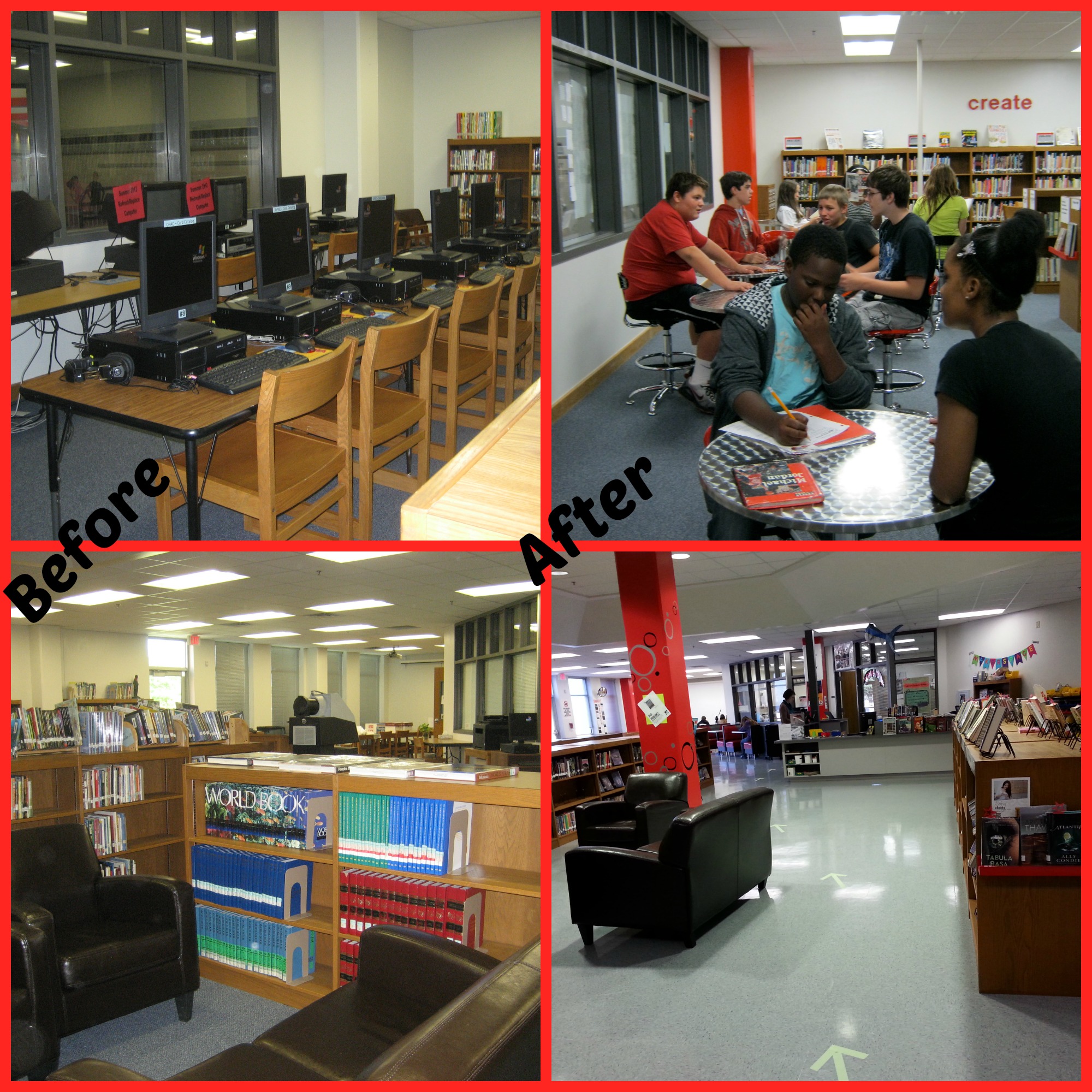 I moved the computers from the front of the library and added cafe seating so that when students walked by the library they wouldn’t see dangling cords, but other students reading, studying, and enjoying the library.