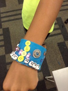 Instead, I pulled out some felt and started adding notions, and told them, “Just get started. Start adding stuff and see where it takes you.” From that point on the girls got really quiet and started making and crafting. They plugged in their headphones, or chatted quietly and started designing. One girl made a bracelet declaring her love for her favorite show, another made one based on her favorite band, while a third made many bracelets about her favorite video game “Legend of Zelda.” A young boy came in and wanted to join in. We welcomed him and let everyone craft for about an hour.