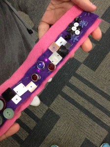 I had so much fun that I checked with my local teen librarian Dana Tucker to see if she’d want to collaborate on a wearable class this summer. We decided to make E-textile cuffs based on a lesson I found in Dr. Peppler’s Soft Circuits book.