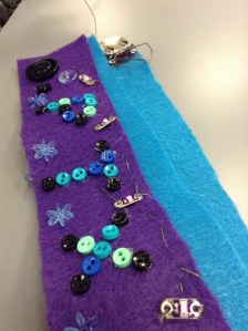 It was amazing! Because collaborating with others makes things flow more smoothly. Dana Tucker did a great job! She pre-cut the felt into cuff size, she had hot glue guns at the ready, a great array of notions for adding embellishments to projects, and she brought in an assistant who has a great working knowledge of sewing.