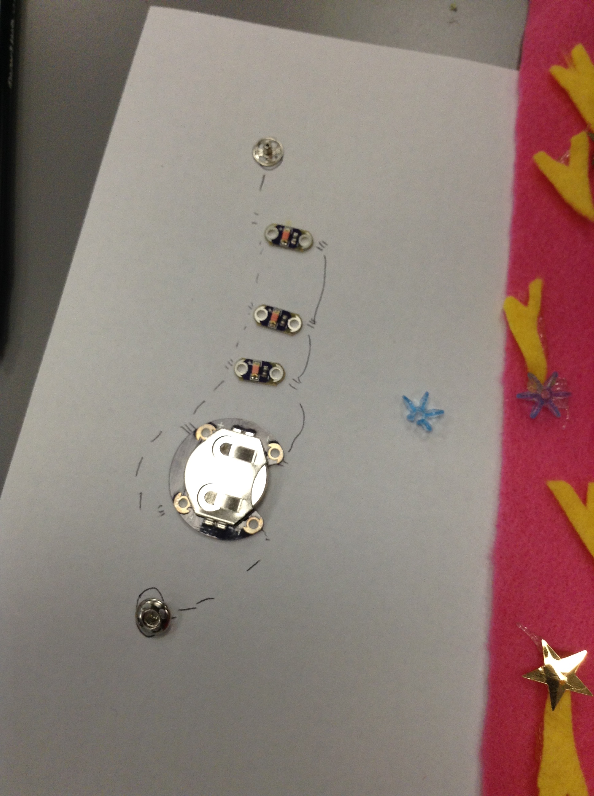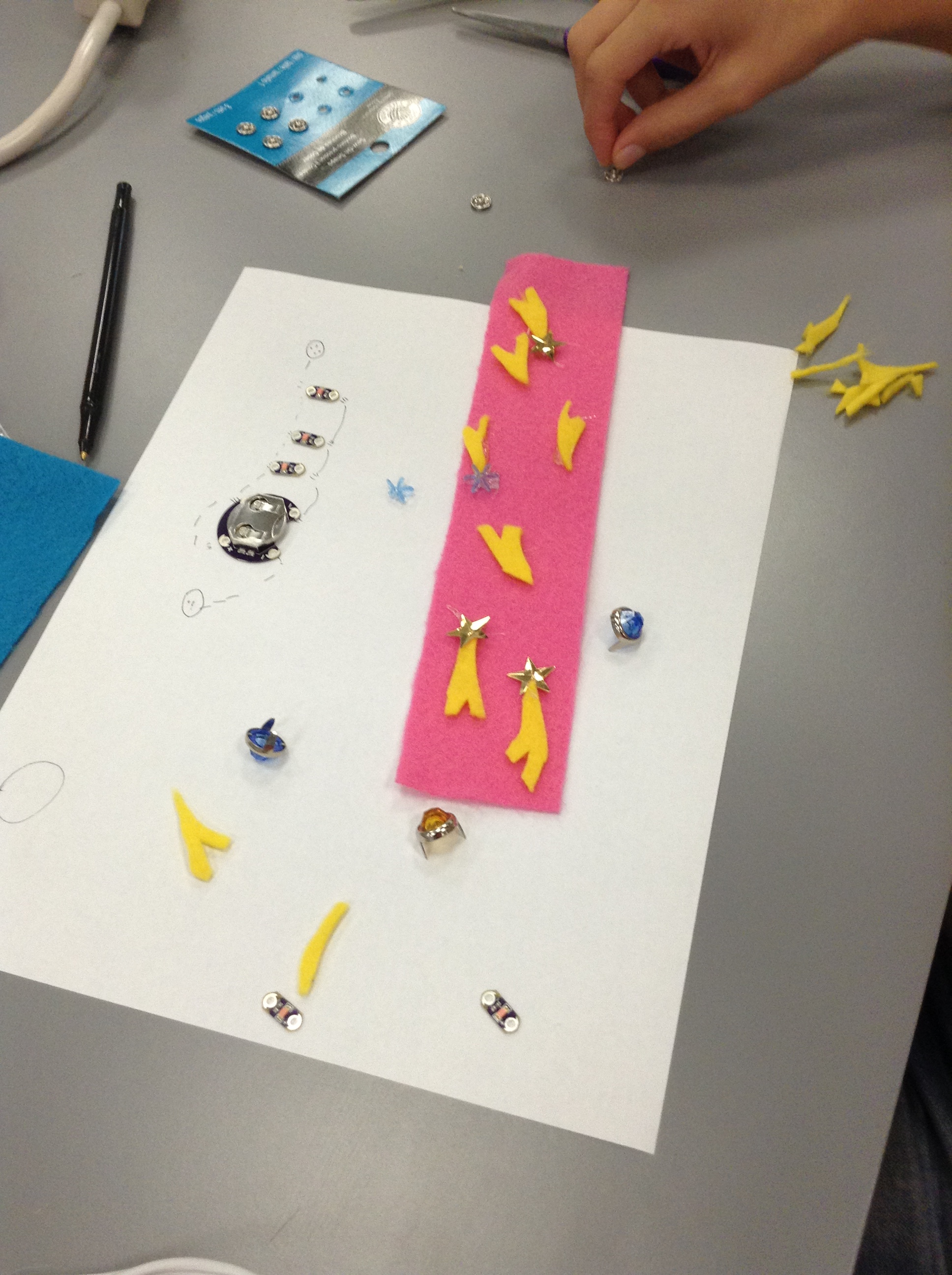 We made copies of circuit diagrams, showed the kids my original project, and told them to design their own light-up wrist cuff.