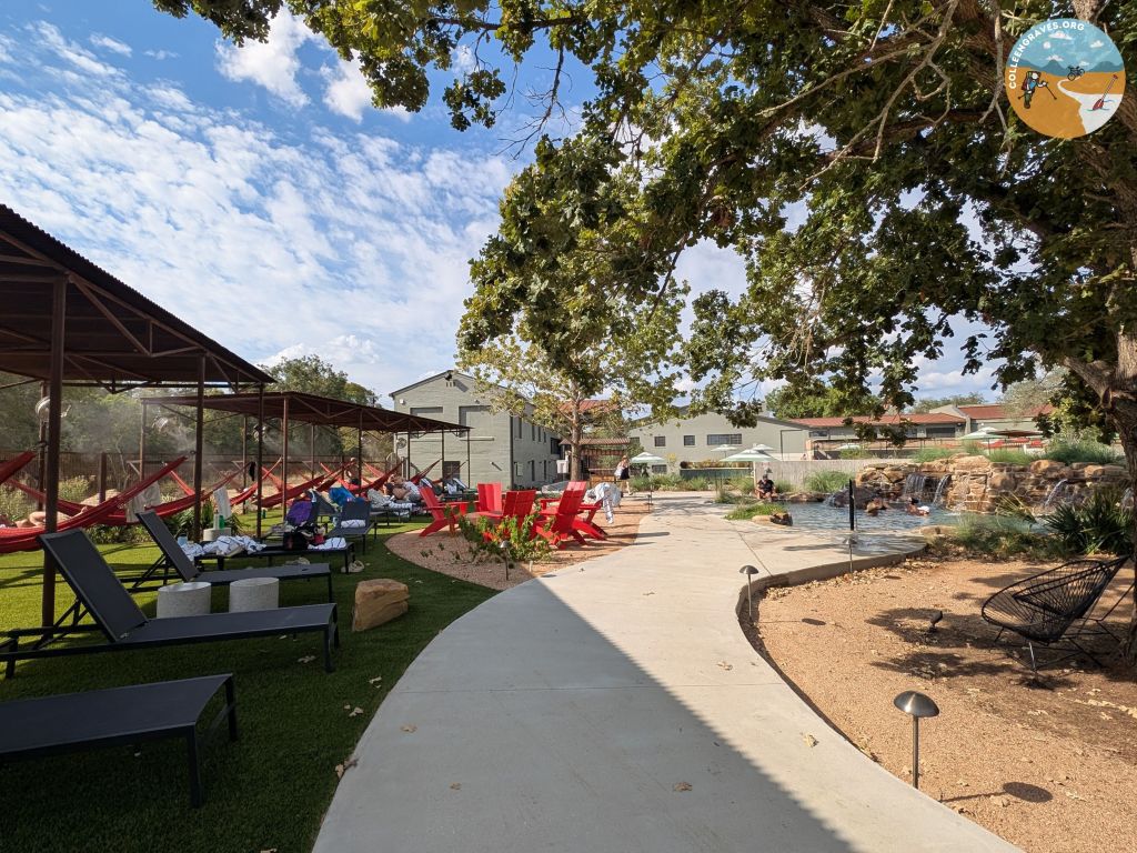 My other favorite pool was the Cypress pool that seemed to be at the perfect temperature for a Texas fall day (aka it was hot, but not summertime hot.) This pool bottom was covered in stones that were supposed to be therapeutic for your feet (we found them sort of painful, and okay at the same time… but not therapeutic.) The temperature and minerals were just right in this pool! Plus, it mostly remained in the shade thanks to a giant oak tree. The Sage pool was pretty, but it was quite busy, loud, and not that relaxing. We spent the majority of our time in the Ivy pools (hot/cold plunge.) and Cypress pool. There was a barrel sauna by the cold plunge, but I didn’t try it out. I loved the lounging areas, and hammocks, but it took quite some time for those to open up! Lots of people left their things on the hammocks as to save them.
